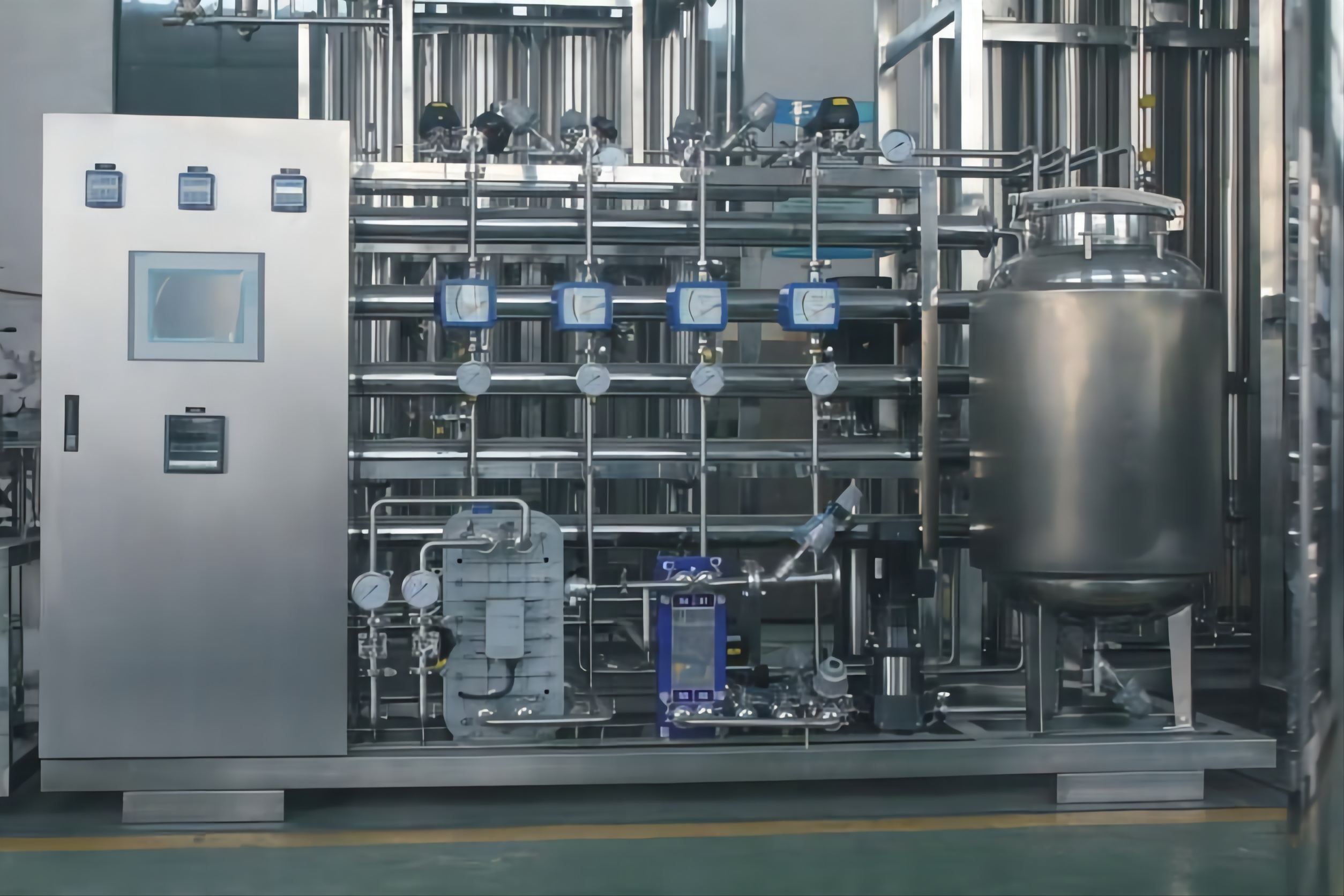 ②工藝:預(yù)處理系統(tǒng)→一級(jí)高壓泵→一級(jí)RO反滲透→級(jí)間純水箱→二級(jí)高壓泵→二級(jí)RO反滲透→二級(jí)純水箱→EDI輸送泵→EDI電除鹽系統(tǒng)→無菌純水箱。