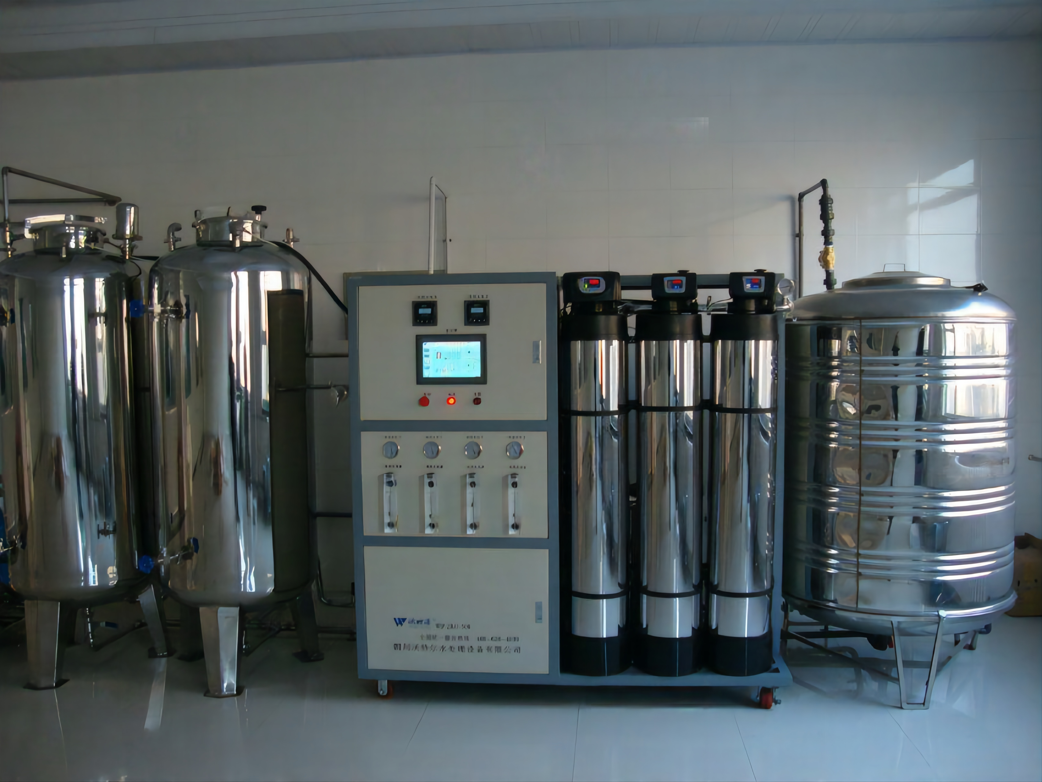 ②進(jìn)水→原水箱→原水泵→多介質(zhì)過(guò)濾器→活性炭過(guò)濾器→軟化過(guò)濾器→保安過(guò)濾器→一級(jí)高壓泵→一級(jí)RO反滲透→純水箱→EDI輸送泵→EDI電除鹽系統(tǒng)→無(wú)菌純水箱→臭氧滅菌裝置→純水輸送泵→UV紫外滅菌儀→0.22μm終端過(guò)濾器→出水口→連接輸送管道;